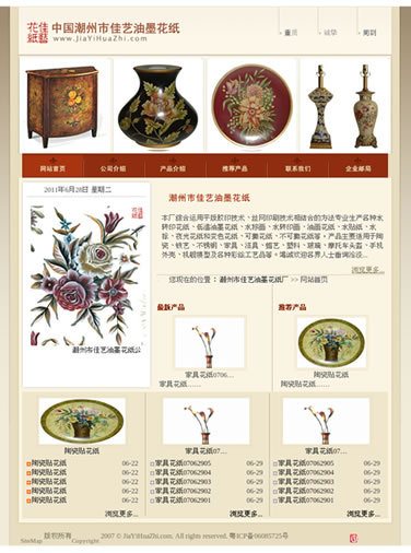 潮州佳艺油墨花纸厂官方网站自2007年建立至今, 网站运营已有4个年头,网站作为公司对外宣传的窗口,起到了介绍公司的产品,传递公司营销理念的作用。在公司产品不断丰富,网络技术不断更新的今天,公司为适应企业的发展,决定对公司网站进行全面改版、升级。